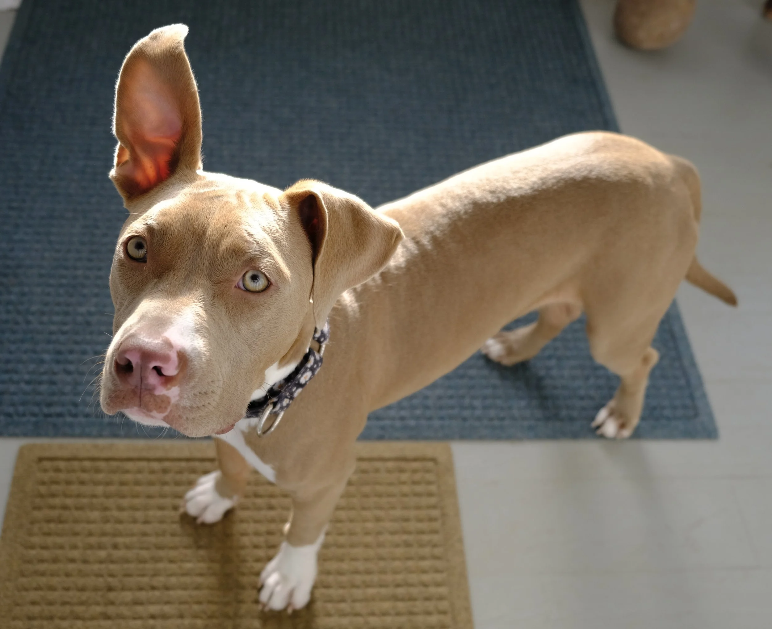 Over the next couple of weeks we realized that she obviously had never lived indoors before (except the month with the foster, but there were 6 dogs in that house and Lola was crated or was playing outside), and she would pee even after having been out for 30-45 mins. Oy! We removed all the rugs; jotted down her daily routine on a small white board…when she ate, especially when we took her out, and what happened.